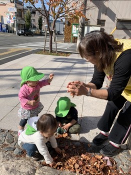 はいはい組は先生と手をつなぎ歩いてお散歩に行ってきました♪