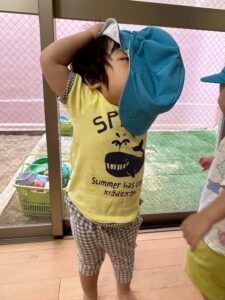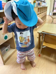 帽子を取りに行って自分でかぶろうと頑張っていますよ~