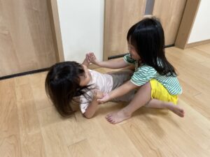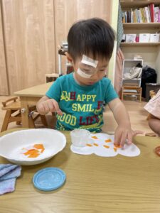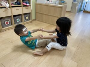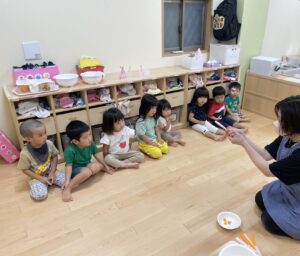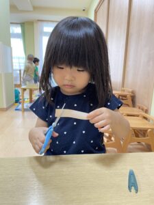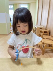 初めてハサミを使うので、使い方や持ち方、使う時の約束事を伝えると、興味津々のきらきら組💕