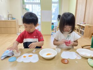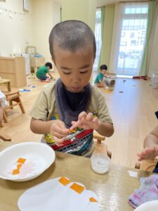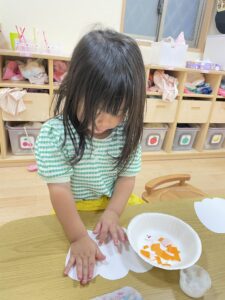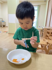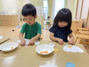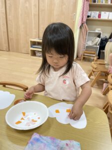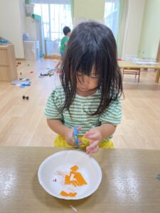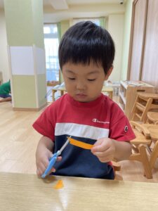 「オレンジの折り紙をハサミを使って小さく切るよ」