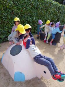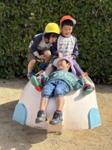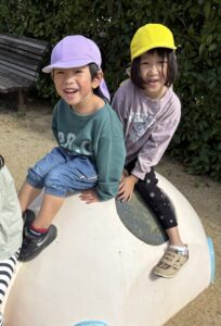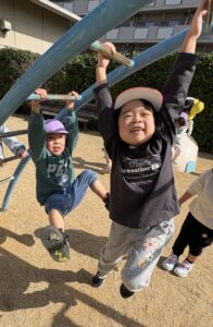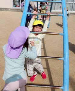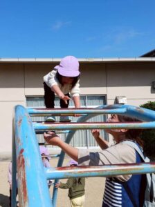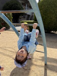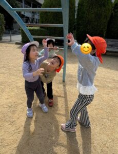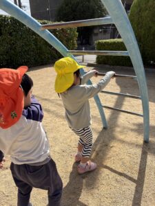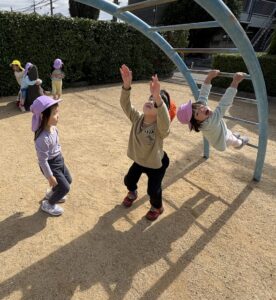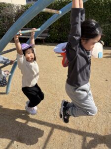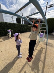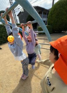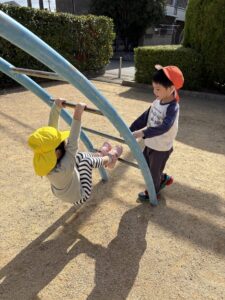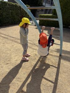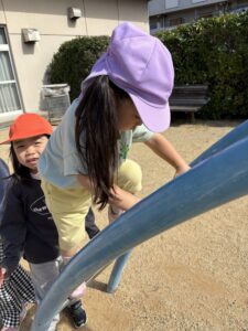 その様子をみていたにじ組のお姉さんも加わり、つかみ方を伝えてくれたり「ちょっと高いから持ち上げたるわ!」と持ち上げようとしてくれたり、2人がかりで一生懸命教えてくれる姿が頼もしかったです😊