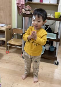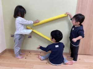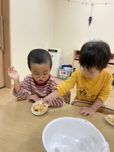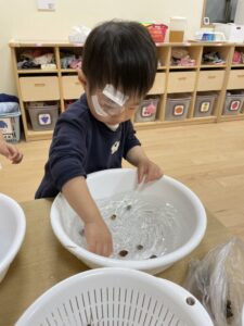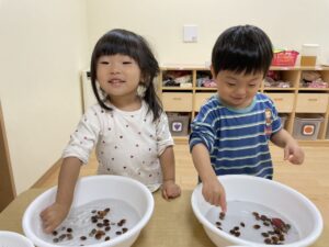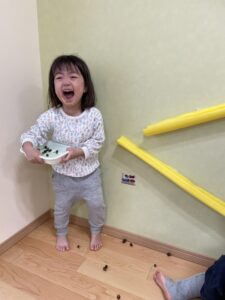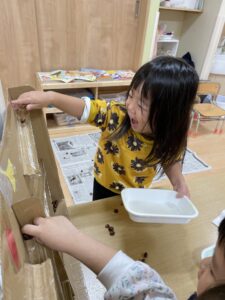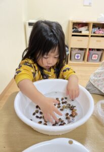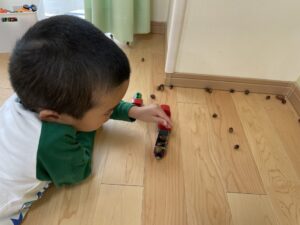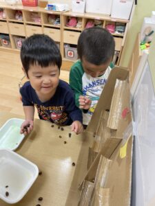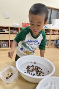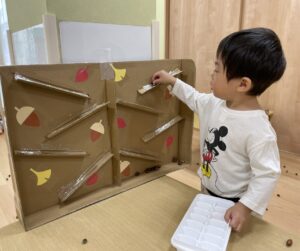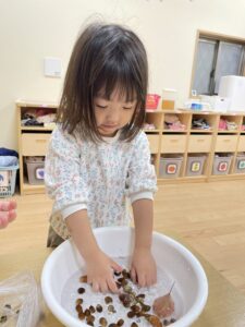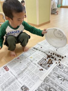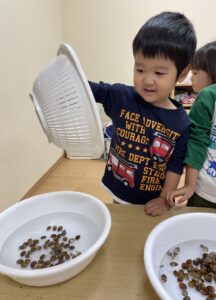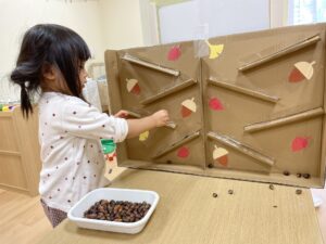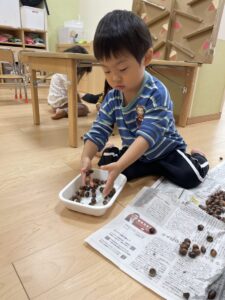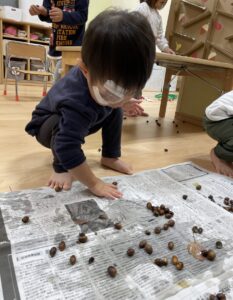 今日のきらきら組は先週のおにぎり遠足で拾ったどんぐりで遊びました