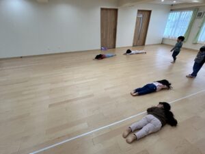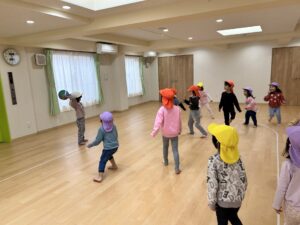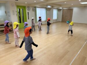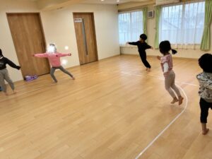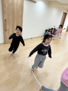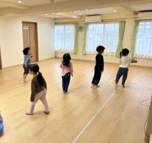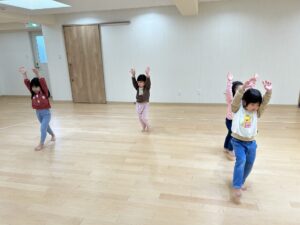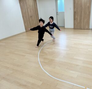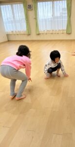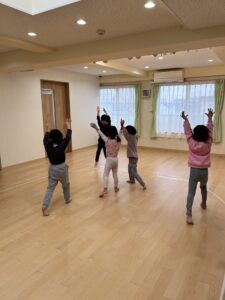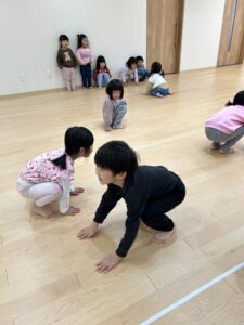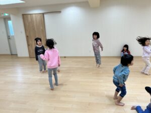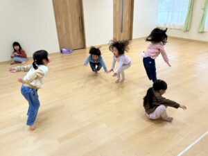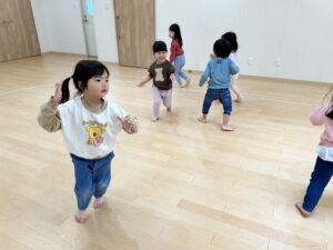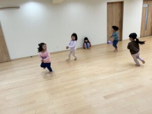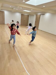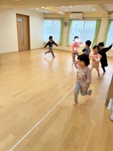 とんびのように手を上下に振りながら走り、最後はピアノにあわせて片足を前に出しながら走り跳びをします!