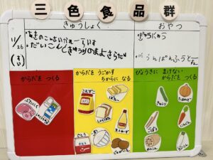 三食群のボードはろぉたすぷらすの本棚の上に毎日置いてあるので送迎の際によかったら見てみてください♪