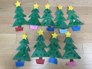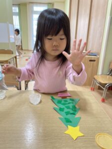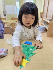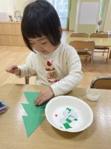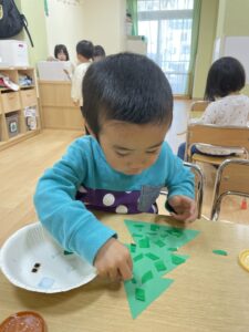 次はツリーの形の画用紙に、切った折り紙を糊で貼って・・・