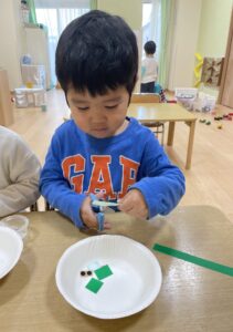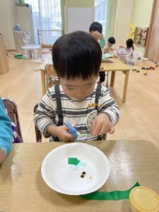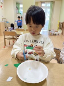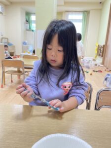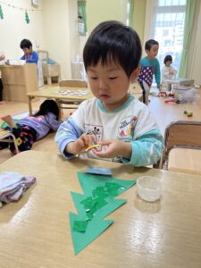 最初は緑の折り紙をハサミでチョキチョキ✂