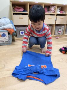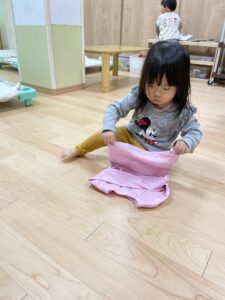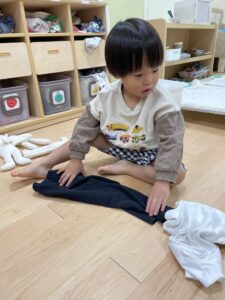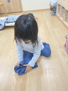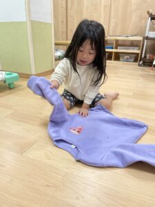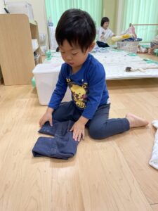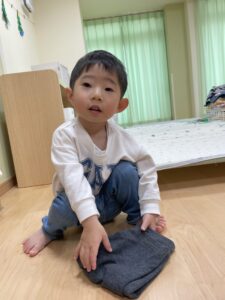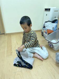 服を畳む事で手指を使い、手指の発達を促し、自分で出来た事で達成感を味わう事ができます