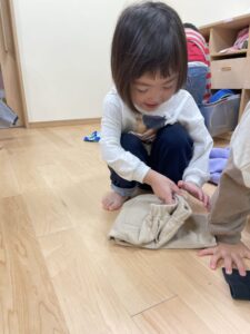 進級、入園時から衣服の着脱は保育士が見守る中、自分で着替えをしているのですが、今では脱いだ服を畳んで洗濯バックの中へ入れています