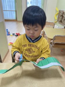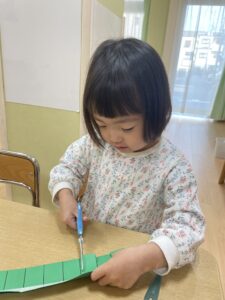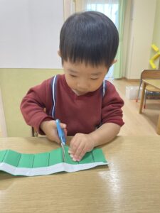 画用紙に書かれた線の上をハサミでチョキチョキ✂