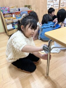 棚の後ろから手拭きタオルかけまで・・・!「こっちも!」「あっちも!」と自分たちで話し合いながら隅から隅までピカピカに拭いてくれました✨