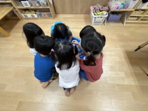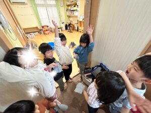 「みんな集まって~!」という子どもの声掛けとともに「お掃除、がんばるぞー!えいえいおー!」とやる気満々でした(≧▽≦)