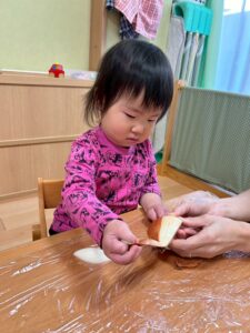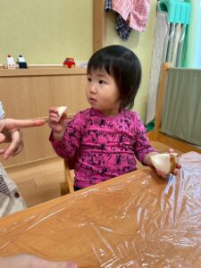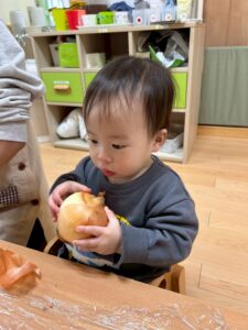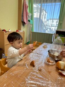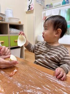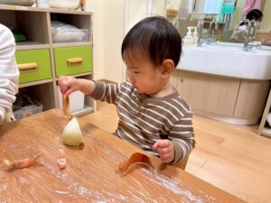 「みんながよく食べている玉ねぎって、じつはこんな形をしてるんだよ」「玉ねぎには皮があるんだよ。今日はみんなで皮をむいてみよう!」と伝えて皮むきスタート!!