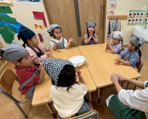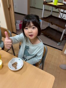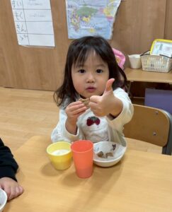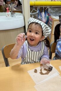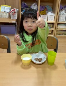 おやつが終わり、今日の材料を振り返ると「今日のクッキーは小麦粉・砂糖・マーガリン・ココアだよね!」と答えてくれバッチリなそら組でした♡