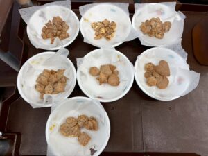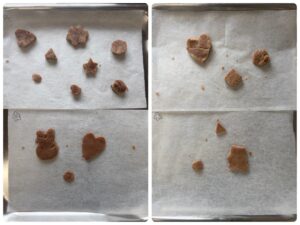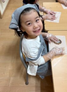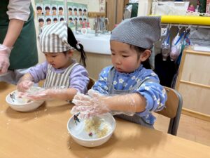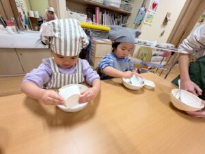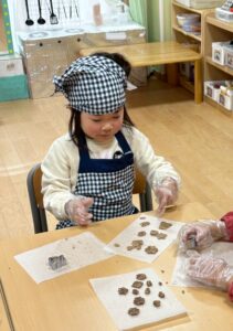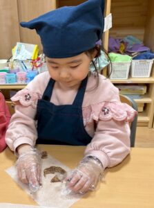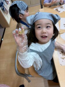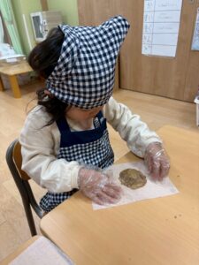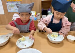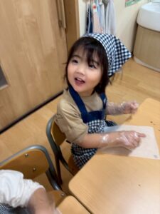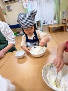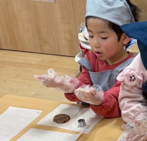 「割れちゃうからゆっくりしよう」「早く食べたいなあ」「○○ちゃんのかわいいね~」と楽しく話しながら型抜きをしていました。