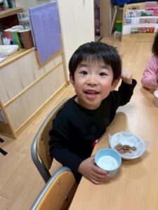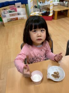 調味料クイズを行なってから、給食やおやつの中身が気になるそら組。