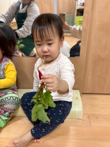 土を落としたラディッシュを見ると、みんな興味津々👀