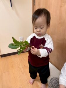実をにぎにぎしてみたり、葉っぱをなでてザラつきを感じてみたり、思い思いに楽しんでいました。