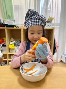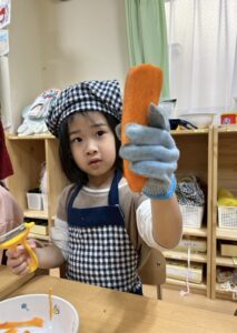 たいよう組はピーラーを使ってにんじんの皮むき、にじ組は包丁を使ってキャベツを切ってみました。