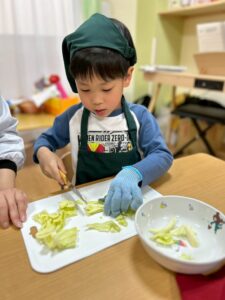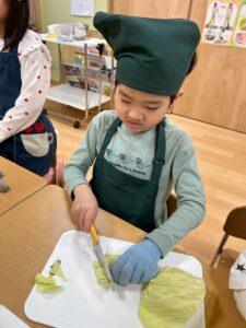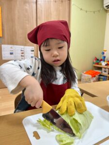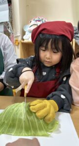 続いてにじ組!はじめは大きくて丸みを帯びたキャベツの葉をどう切ろうか悩んでいる様子でしたが、「押して平べったくして切っていいのかな?」「わたしは端から少しずつ切っていく!」と思い思いの方法で取り組んでくれました。