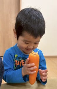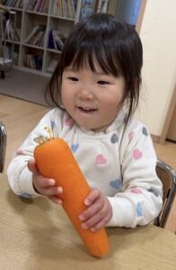 『触ってみる?』と聞くと「うん!」と言ってくれたので、まずは人参に触れてみます🥕