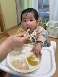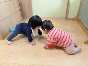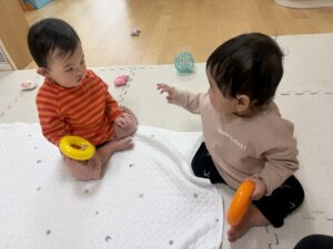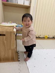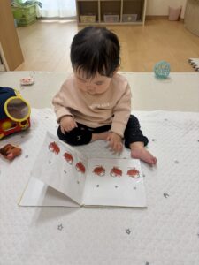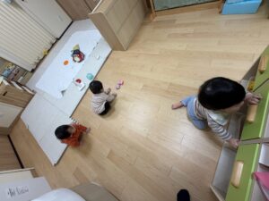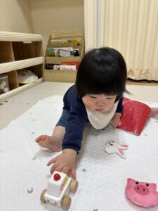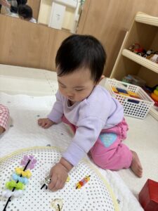 登園すると、寂しくて涙する時間がありますが、気持ちを受け止め安心すると、気になるおもちゃに手を伸ばし触っています。
