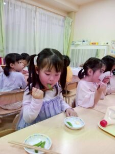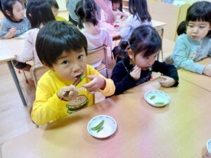 そして今日は、にじ・たいよう組で豆むきをしました!