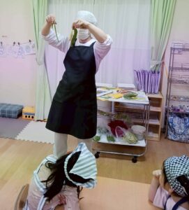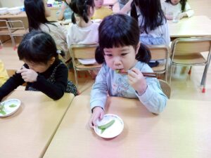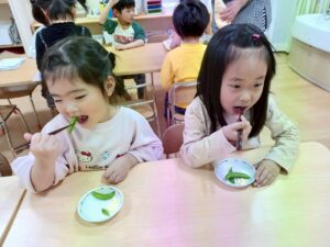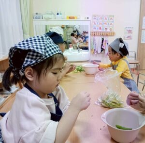 スナップえんどうは、給食室で茹でてすぐにいただきます😋