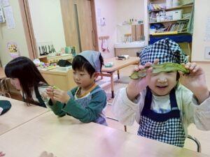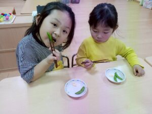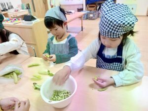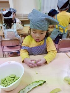 「豆ごはん」に使う『うすいえんどう』の豆むきをしよう!!