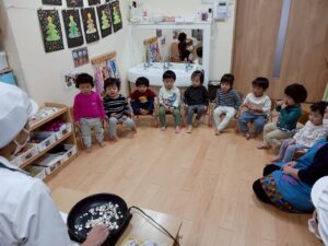 みんなが大好きな『だるまさん』を取り入れた演目で、絵本はどてっ。やびろーん。などの言葉が楽しく感じられ、つい身体を動かしながら楽しんでみている子どもたちです。