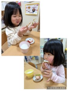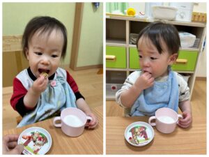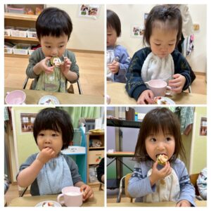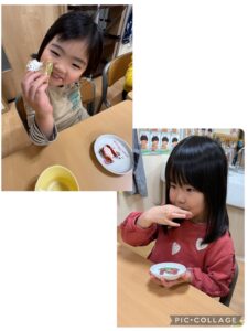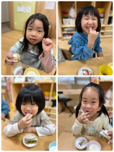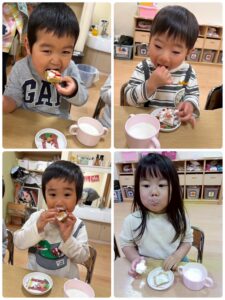 「これかわいいでしょ」「僕のも見て~」と自分のクッキーをお友だちに見せ合う姿や、パクパクと食べ終わって「もっと食べたかったなあ」と話している姿もありました。