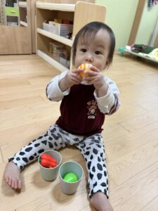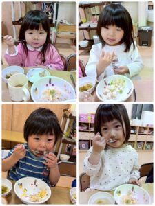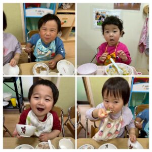 はじめは保育士がすくって口に運ぶというところから、少しずつ自分ですくうこともやってみようとする姿が見られます🎵