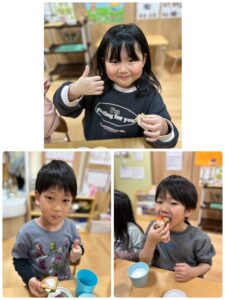 今回の食育を通して、栽培の楽しさやお手伝いへの意欲、そして「食べる事が楽しい」という気持ちに少しでもつながると嬉しく思います。